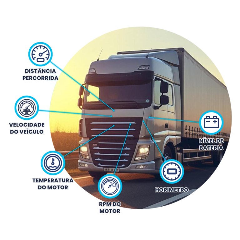 Entre as informações acessadas estão: consumo de combustível, RPM do motor, velocidade do veículo, status do freio, temperatura do motor, e outras condições críticas que ajudam no gerenciamento de frotas e na análise de desempenho.